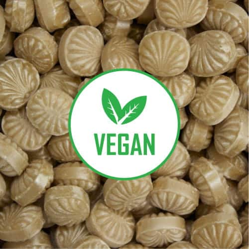 25 kg. Flowpakkede bolsjer med eget Logo – Veganske – Karamel