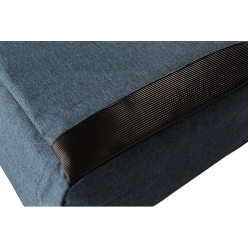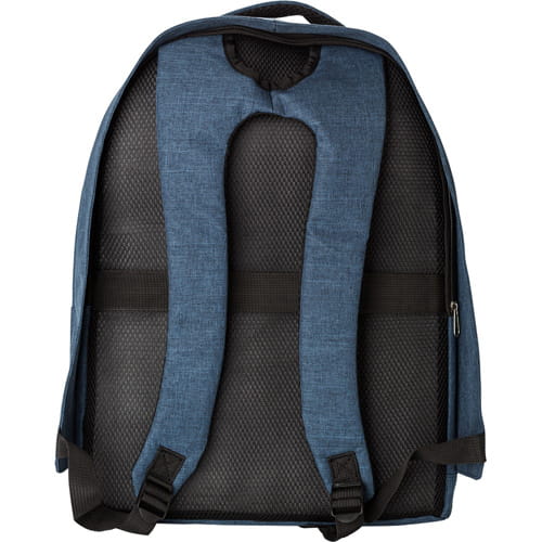 blå Tyverisikret rygsæk med trolleyrem bagpå, lynlåslomme foran, to sidelommer, stort indvendigt rum med et laptoprum lukket med velcro, justerbare stropper, bund lavet af genbrugte bildæk, 35 x 15 x 50 cm