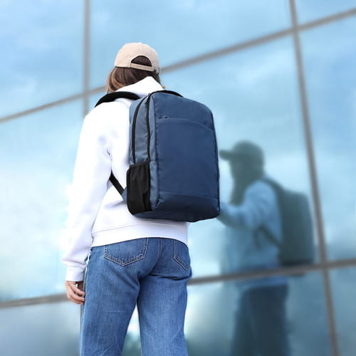Rygsæk lavet af blødt PU. Med hovedlomme med lynlås og dobbelt lynlåstræk. Indvendig lomme til bærbar computer op til 15 tommer. Inkluderer frontlomme med usynlig lynlåslukning. Polstret ryg og stropper med åndbart stof og justerbare stropper. Inkluderer polstret håndrem og transportrem til justering af trolley eller kuffert, ideel til rejser.