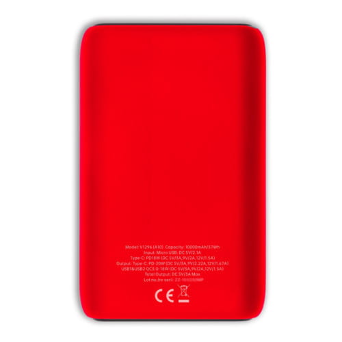 Powerbank 10000 mAh, 4 dioder der angiver strømniveau, gummibelægning, micro USB og USB-C (18W) indgange, 2 USB (18W) udgange, USB-C (20W) udgang, kan oplade tre enheder samtidigt, USB-C kabel medfølger.