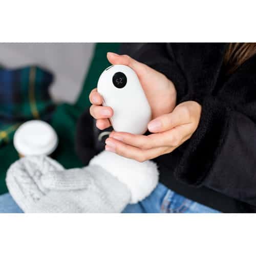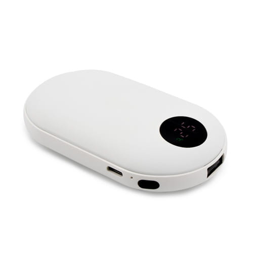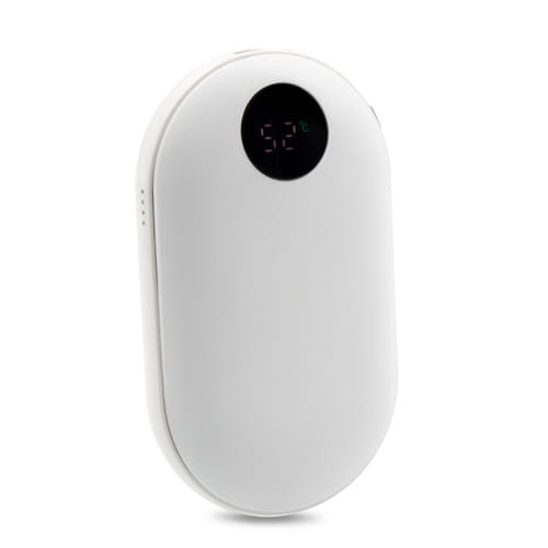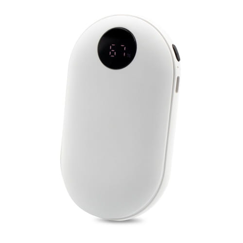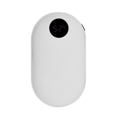 Powerbank 5000 mAh, for- og bagside med gummibelægning, håndvarmerfunktion med 3 intensitetstilstande (maks. 42°C / maks. 47°C / maks. 52°C), USB-udgang 5V/2A, USB-C 5V/2A-indgang, digital visning af batteriniveau, håndvarmerfunktion, arbejdstid ved 1 powerbank-opladningscyklus: ca. 6 timer, medfølgende USB-C-kabel, produkt fremstillet af ABS