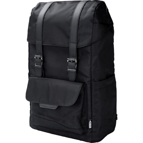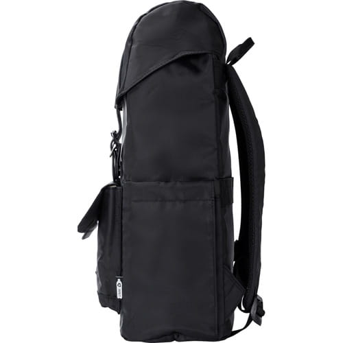 Rygsæk med klap af RPET, to sidelommer, forlomme lukket med magnet, inderlomme lukket med snor, lomme til en 15″ bærbar computer, vandtæt belægning på tasken.