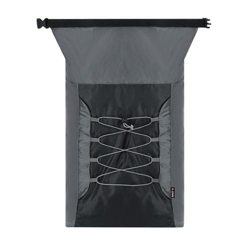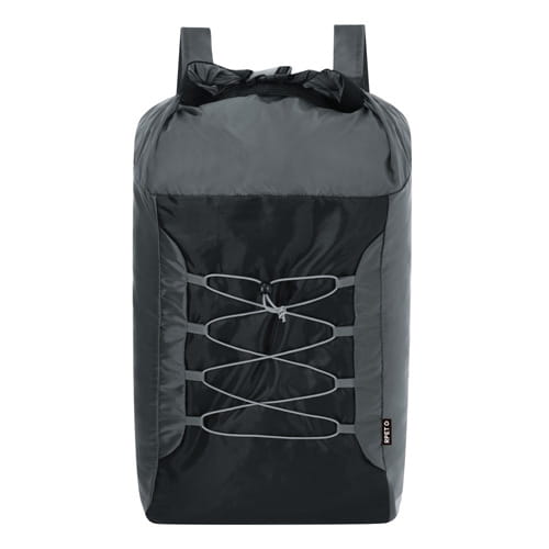 Sammenfoldelig rygsæk lavet af slidstærkt RPET 210D og ripstop-polyester. Med løkkelukning på hovedrummet, elastiske snøre og justerbare skulderstropper. RPET-materialet er lavet af genbrugsplast for at fremme genbrug af plastaffald og bidrage til planetens bæredygtighed.