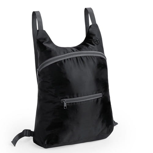 Sammenklappelig rygsæk i blød polyester 201D i lyse toner, med lynlåslukning, frontlomme og hovedtelefonudgang. Med forstærkede hjørner, justerbare skulderstropper og gråt tilbehør. Lille, sammenklappelig størrelse med bærerem.